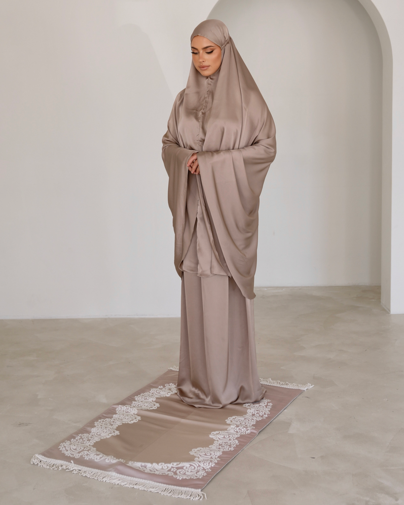A Silk Prayer Set designed for ultimate coverage and comfort. Crafted from a soft and fluid silk fabric. Silky soft, effortless, opaque, and hassle free design.