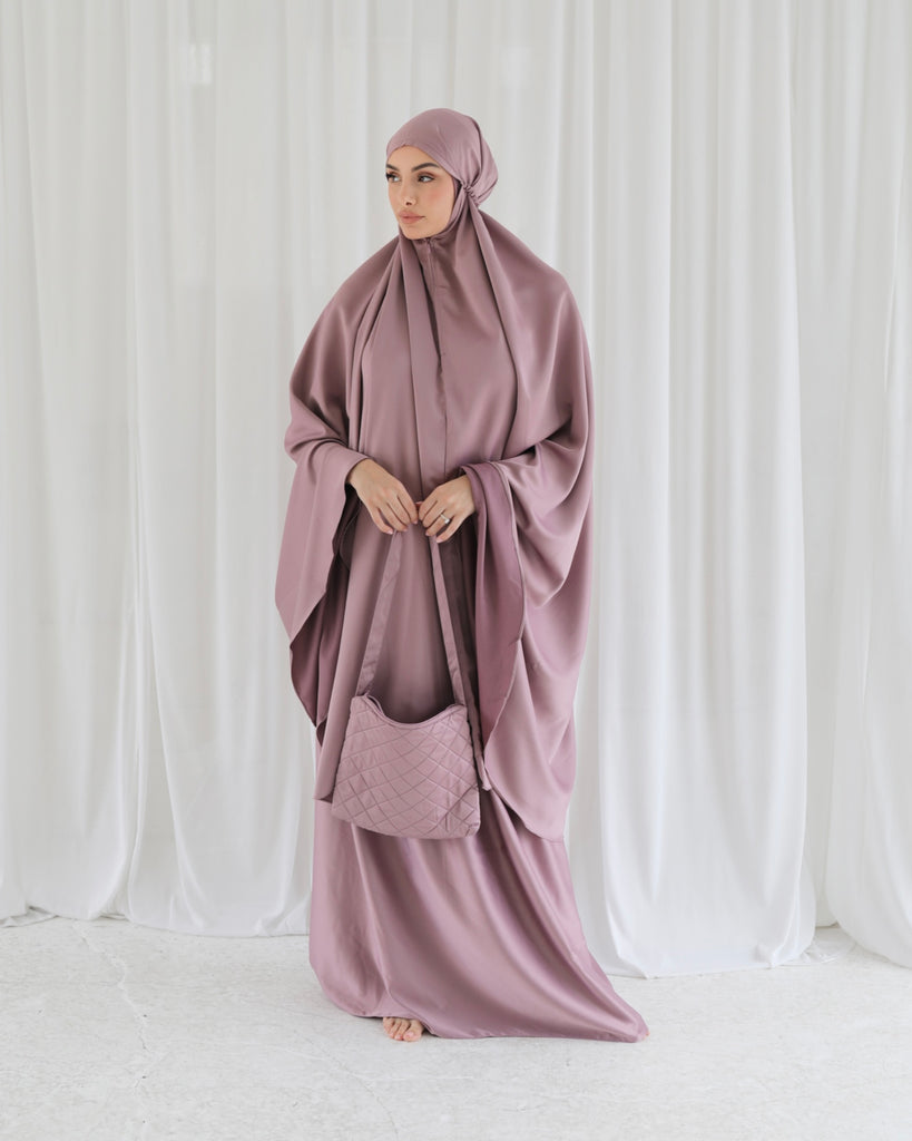 A Soft Sateen Prayer Set designed for ultimate coverage and comfort. Crafted from a soft and fluid sateen fabric. Silky soft, effortless, opaque, and hassle free design suitable to be worn in colder months. Matching with the GIRLS SILK PRAYER SET IN VINTAGE LILAC.