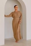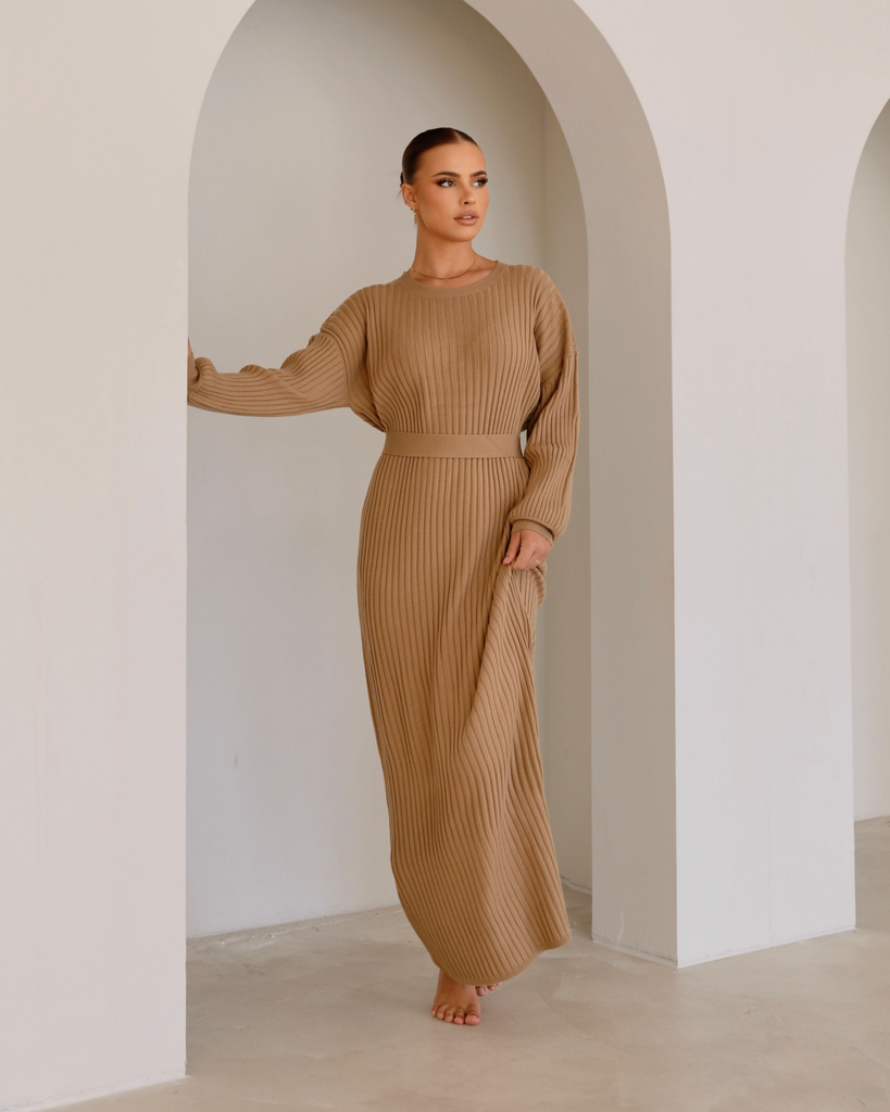 A staple piece for every modest wardrobe, our relaxed fit maxi knit dress is the go to for colder months. Crafted with a round neck, dropped shoulder and bell sleeves. Complimented with a tie belt to adjust the fit to your liking. Guaranteed modest fit, this knit dress will not accentuate your form.