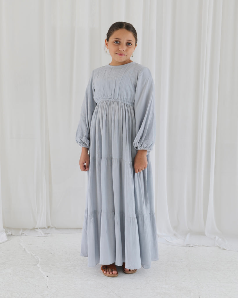 Our Zahra Dress is a staple dress for girls' modest wardrobe. A simple tiered design paired with ballon sleeves adds elegance to this dress. Crafted in cotton fabrication, this dress is suitable for all seasons. The elasticated waist and fitted bodice complement the volume of the full-length tiered skirt. it also comes with a zipper on the back for ease of wear.