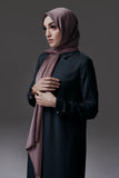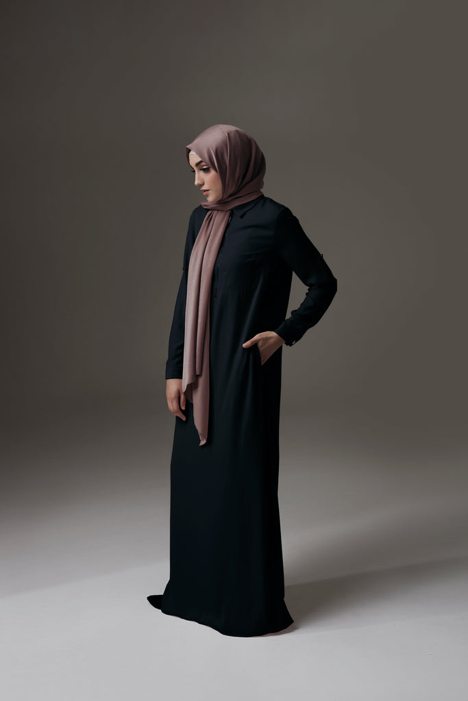 - Model wearing light beige detailed long dress size 8 paired with mauve luxe hijab
