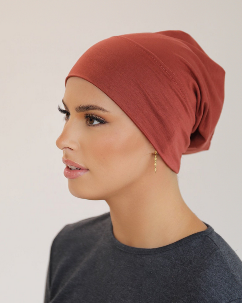 Our cotton tube undercap is suitable to be worn underneath any hijab material. It maintain its shape while providing the stretch you need to allow the undercap to fit comfortably. It is non slip and durable. We designed it with Japanese cotton so it is breathable and prevent hair loss and scalp irritation.
